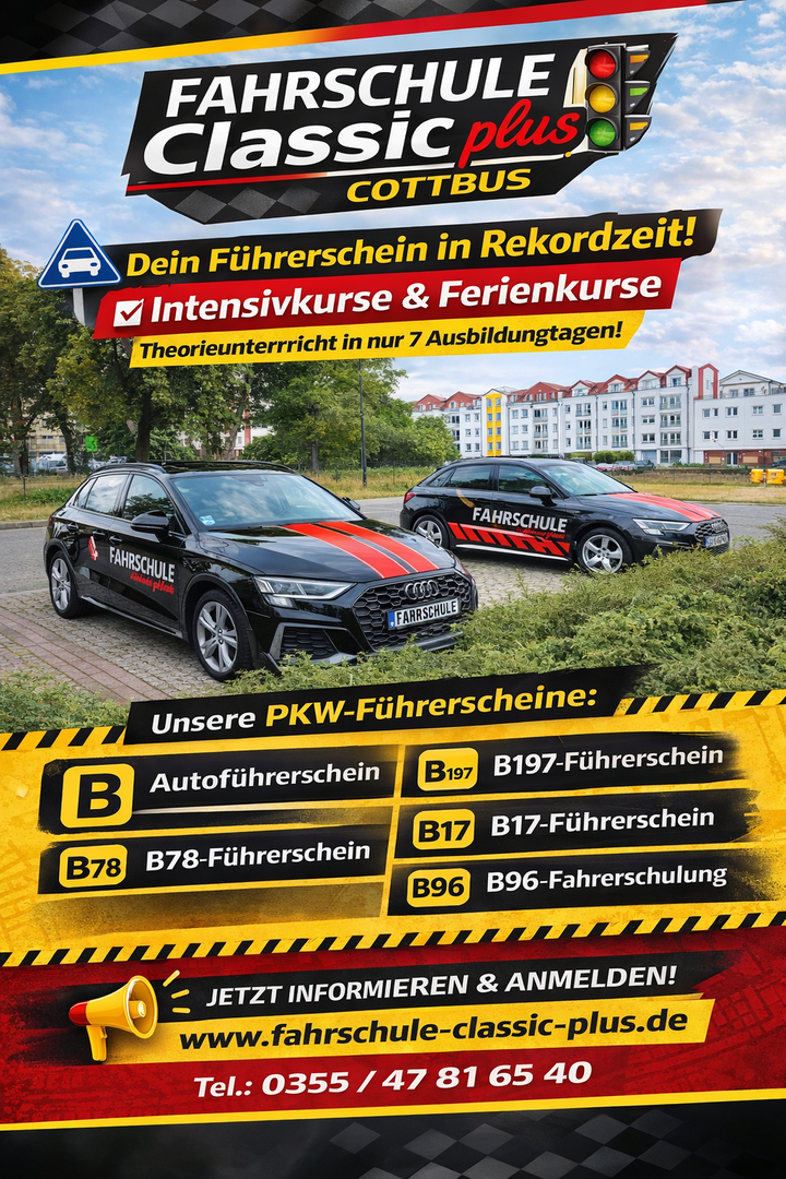 Unsere Fahrschule Classic plus in Cottbus bietet die Ausbildung für die Führerscheinklasse B (Autoführerschein) an.